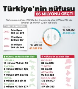 Buna göre, Türkiye’de ikamet eden nüfus, 31 Aralık 2025 tarihi itibarıyla bir önceki yıla göre 427 bin 224 kişi artarak 86 milyon 92 bin 168 kişi oldu. Erkek nüfus 43 milyon 59 bin 434 kişi olurken, kadın nüfus 43 milyon 32 bin 734 kişi oldu. Diğer bir ifadeyle toplam nüfusun yüzde 50,02’sini erkekler, yüzde 49,98’ini ise kadınlar oluşturdu.