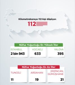 Nüfus yoğunluğu olarak tanımlanan “bir kilometrekareye düşen kişi sayısı”, Türkiye genelinde 112 kişi oldu. İstanbul, kilometrekareye düşen 2 bin 943 kişi ile nüfus yoğunluğu en yüksek olan ilimiz oldu. İstanbul’u 633 kişi ile Kocaeli ve 395 kişi ile en küçük yüz ölçümüne sahip il olan Yalova izledi.